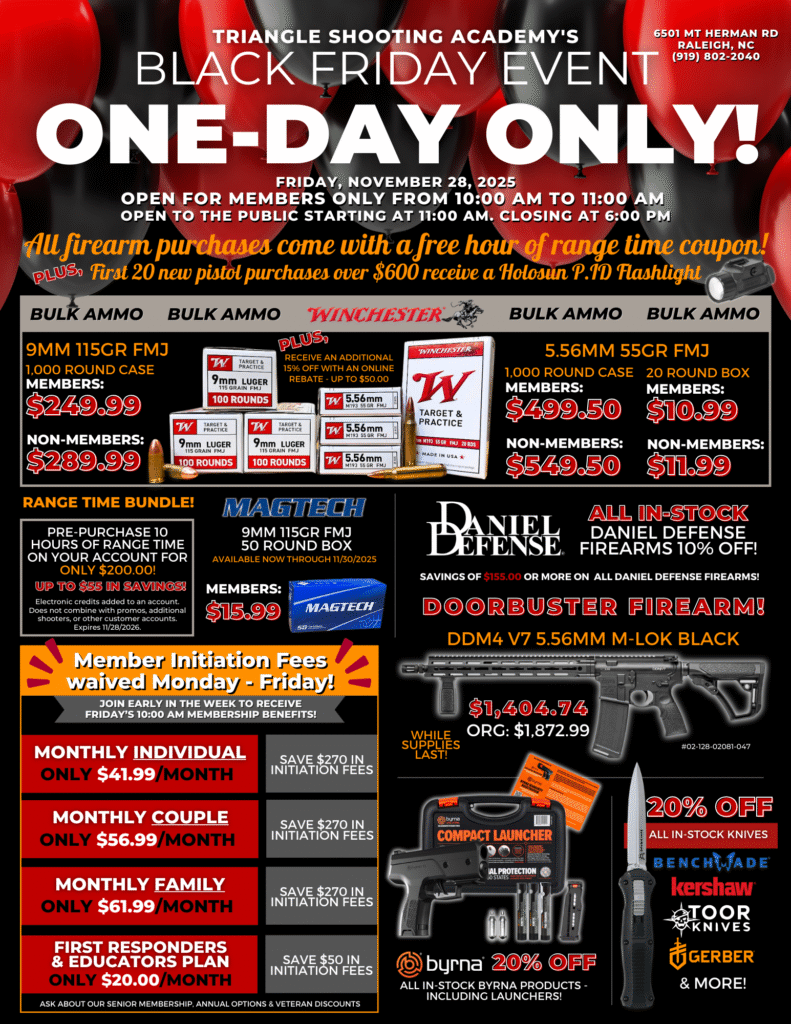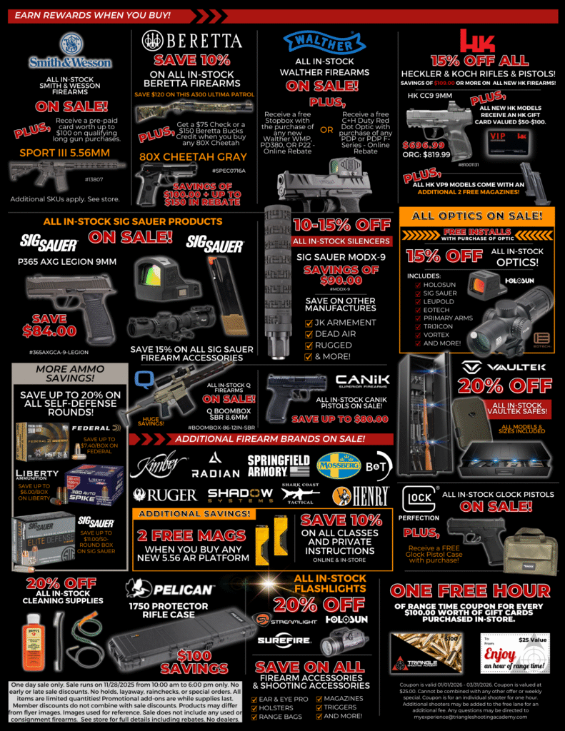 All products & promotional items are limited quantities. No holds, layaways, rainchecks, or special orders on sales items. Some items may be limited in quantity per person. Sale pricing is limited to the date posted on sales events flyers. Discounts and promotions cannot be made before or after the dates printed. Images used in sales flyers may not be an exact representation of the sales items, as photos are used for reference purposes. Coupons and vouchers provided during sales events may have expiration dates. Triangle Shooting Academy reserves the right to change, cancel, or alter any of these promotions without notice. See store for full details.